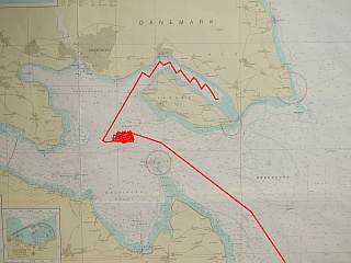 Alle 5 Min. eine Position und fast perfekt notiert Das Wetter am Sonntag war recht mies (zwar Wind, aber auch Regen), daher habe ich keine Fotos vom Rückweg. Nur diese kleine Story: Auf dem Rückweg mit halbem Wind hatten wir auch die Wellen von der Seite. Da ich die als Rudergänger nicht immer sauber aussteuerte, klatschten uns ein paar der höheren Wellen übers gesamte Deck. Worauf Mechthhild zu mir sagte: "Jetzt ist nur das Dach des Pragmaten (des Aufbaus) noch nicht gewaschen." Es dauerte keine Minute, dann war auch das erledigt.
